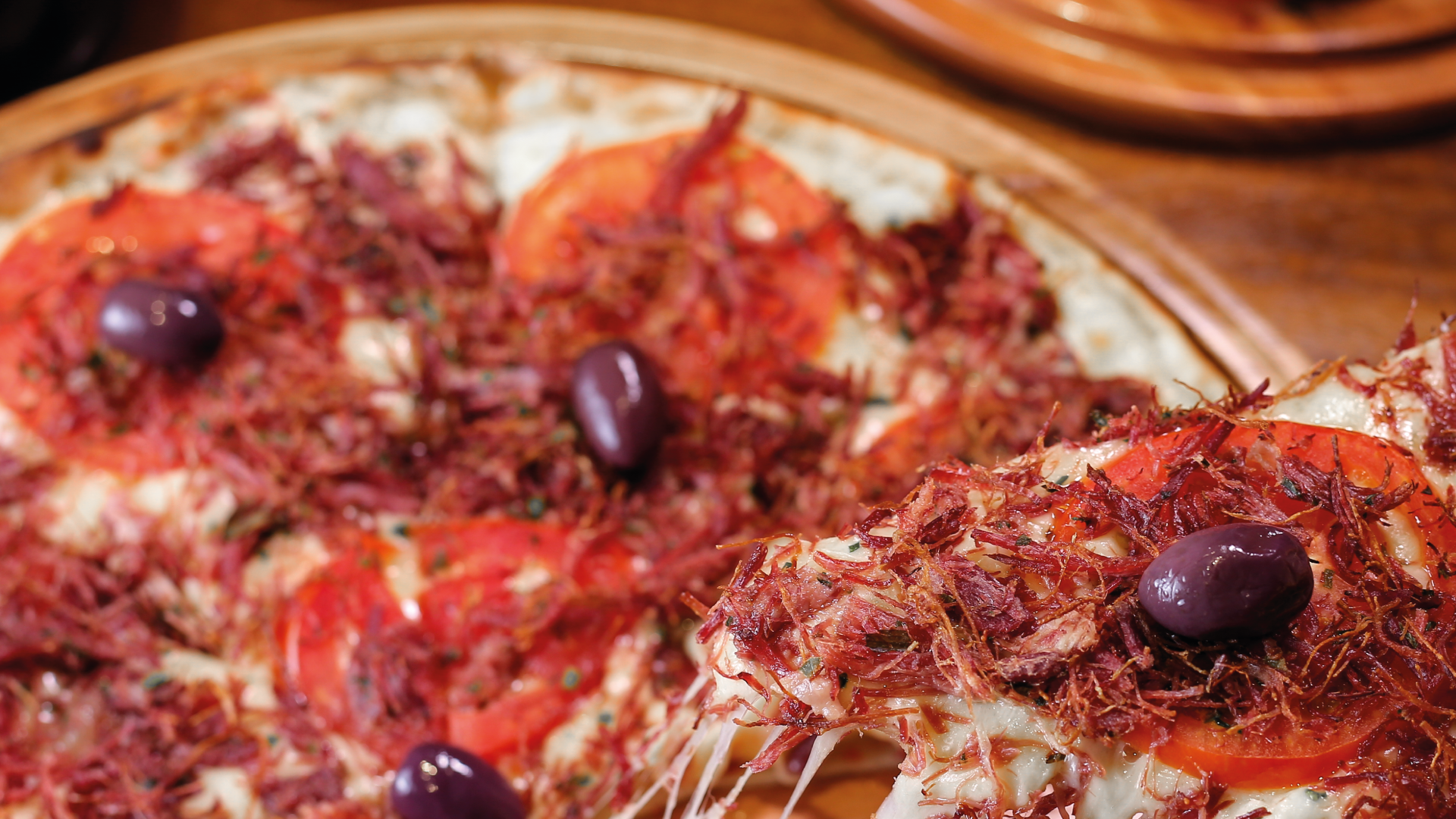 Catupiry, mussarela, carne seca desfiada, ovos, cebola e pimenta seca.
